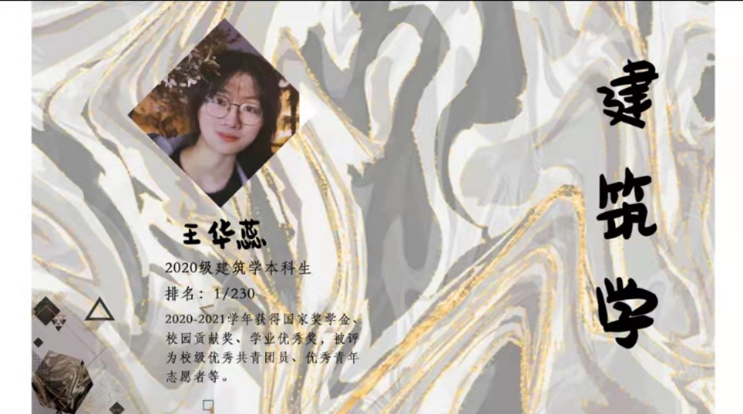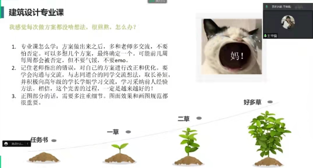 2020级王华蕊同学首先介绍了建筑学专业的相关内容。王华蕊同学讲到,建筑学和城乡规划的思维方式不同。城乡规划偏功能、实用性,重点在平面和流线上,建筑会考虑造型、技术、立面,相比城乡规划更加自由;同时,热爱可抵岁月漫长,选择自己热爱的专业会更容易坚持。王华蕊同学着重介绍了建筑设计专业课的学习心得,她谈到,自己也会在设计方案时感到无力,但重要的是不要气馁并和老师同学,高年级的学长学姐交流,学习采纳前人的经验方法。“志之所趋,无远弗届。穷山巨海,不能限也”,既然选择了建筑学,就一定要有奋不顾身的勇气和持之以恒的毅力,坚持走下去。