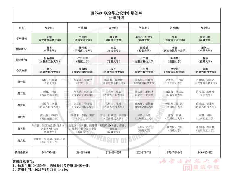 4月14日下午,2022届西部A9+联合毕业设计中期答辩在线上平台拉开帷幕,来自内蒙古科技大学、西安建筑科技大学、长安大学、内蒙古工业大学、西南交通大学、昆明理工大学、兰州理工大学、新疆大学、西藏大学与宁夏大学等国内10所高校近百名建筑类专业师生参加了本次活动。