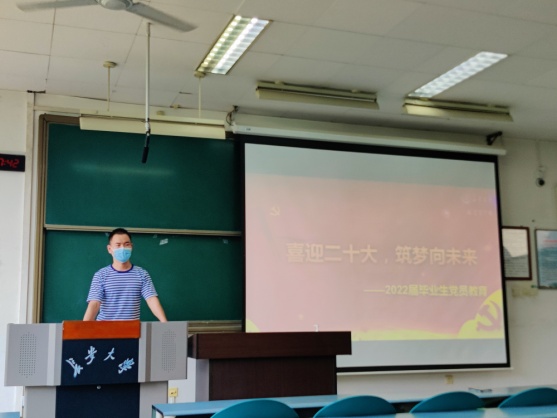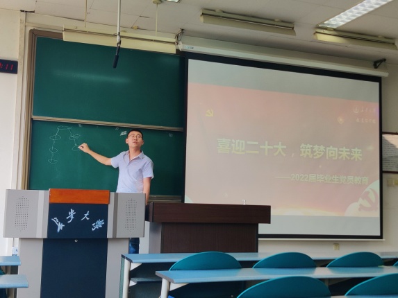 2022年6月16日,澳门巴黎人赌场 在WM1306教室顺利开展“喜迎党的二十大,筑梦前行向未来”——2022届本科毕业生党员教育活动。澳门巴黎人赌场 学生工作办公室主任洪诗迪、2018级辅导员王杰、2022届全体毕业生党员参加本次活动,活动由王杰老师主持。