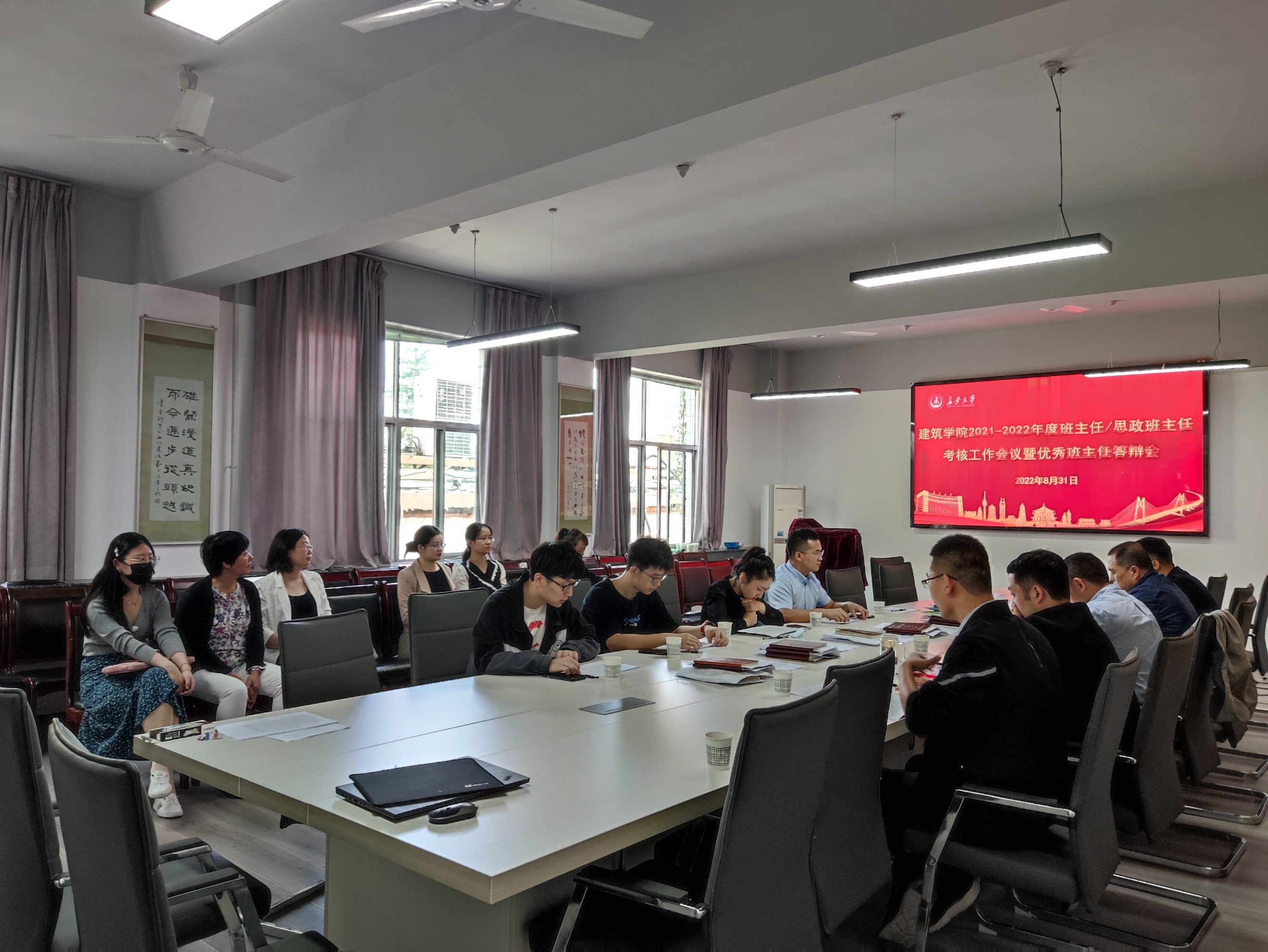 好风凭借力,扬帆正当时。为全面贯彻落实全国高校思想政治工作会议精神,深化“三全育人”改革,落实立德树人根本任务,进一步发挥班主任工作的载体作用,按照澳门巴黎人赌场 要求,8月31日,澳门巴黎人赌场 在建筑馆三楼会议室召开2021-2022学年班主任/思政班主任考核工作会议暨优秀班主任答辩会。澳门巴黎人赌场 党委书记李险峰、院长侯全华,党委副书记刘鹏、副院长余侃华,学办主任洪诗迪,团委书记申一彤,辅导员周艳龙以及优秀班主任申请教师、学生代表参加了此次会议,会议由刘鹏副书记主持。