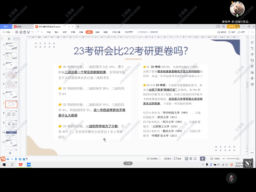 赵诗婧学姐重点从自我评估的准则、专业、自我和外在客观四个方面,为各位23届毕业生提供了全面的自我评估要点;其次她以自身考研经历分析当前考研情况,建议大家综合评估自身,慎重选择目标院校,争取一次上岸!