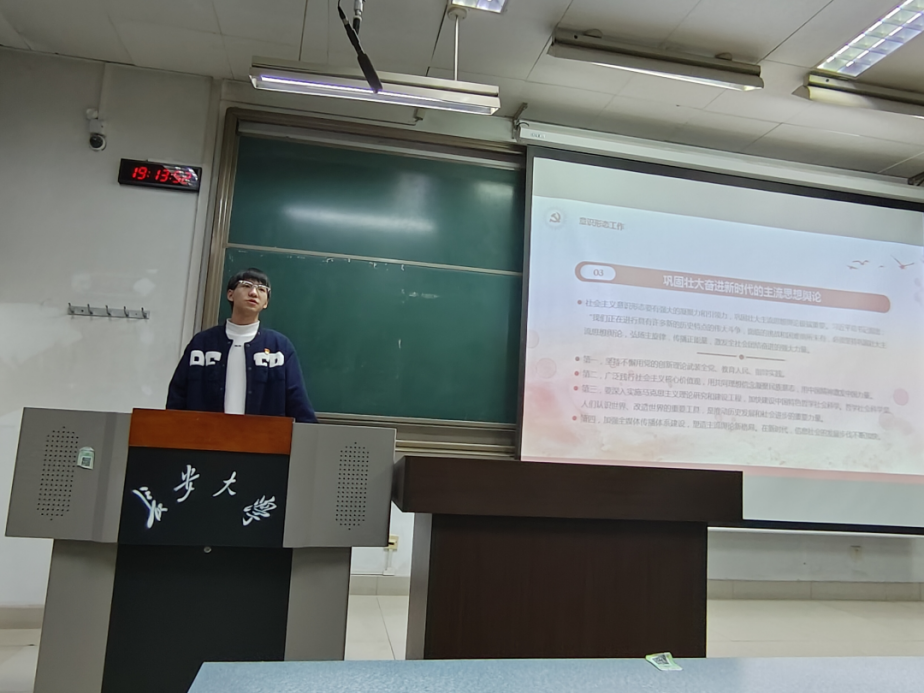 接下来,本科生第二党支部书记谭宇与大家一起学习了意识形态工作的相关要求。谭宇要求全体党员干部要旗帜高扬、立场坚定、斗争坚决,弘扬主旋律,传播正能量,激发全社会团结奋进的强大力量。要持续加强推进意识形态工作的阵地建设,牢牢掌握党对意识形态工作的领导权,巩固壮大奋进新时代的主流思想舆论。