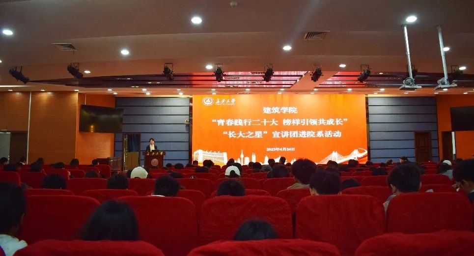 为教育引导广大学生深入学习贯彻党的二十大精神,培育和践行社会主义核心价值观,帮助学生树立科学成才观,进一步加强本科生学风建设,激励广大学生挺膺担当时代使命,2023年4月24日,澳门巴黎人赌场 于北辰楼会议中心二楼报告厅举行了“青春践行二十大榜样引领共成长”长大之星宣讲团进院系活动。澳门巴黎人赌场 党委副书记刘鹏、学办主任洪诗迪、团委书记申一彤、学办全体专、兼职辅导员以及2022级全体本科生和学生党员代表、学生骨干代表参加了本次宣讲会,本次宣讲会由辅导员李博轩主持。