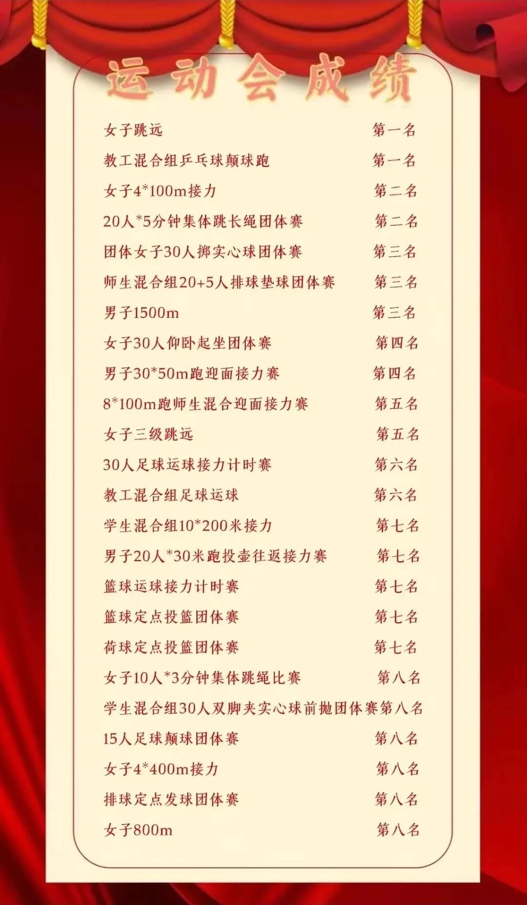 少年自有星光,低头是跑道,抬头是梦想。澳门巴黎人赌场 女子4×100接力比赛获得第二名。女子仰卧起坐获得第二名。男子30人×50米迎面接力赛获第四名。10×200m接力获得第七。