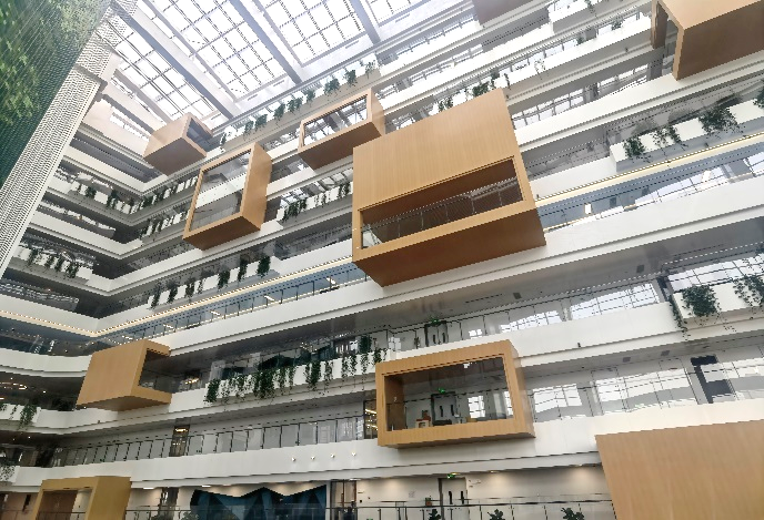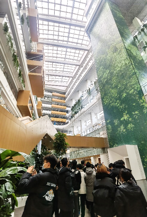 同学们依次参观了大厦中庭空间、工作区域及休息区域,近距离观察到建筑设计、建造、运维过程中所运用的环保低碳的绿色建筑技术、数字化办公系统以及智能化管理系统;体会到设计对处于建筑中的人及其行为所带来的潜移默化的影响。通过在建筑中的具身体验及工作人员的讲解,同学们被数字技术在建筑中的应用深深吸引,深刻感受到数字科技对建筑设计的引领、建筑智能与行为方式的结合。