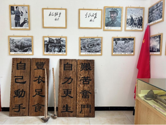 倚墙放在“自己动手,丰衣足食”和“自力更生,艰苦奋斗”的牌匾中间的“传家宝”——两把老镢头。