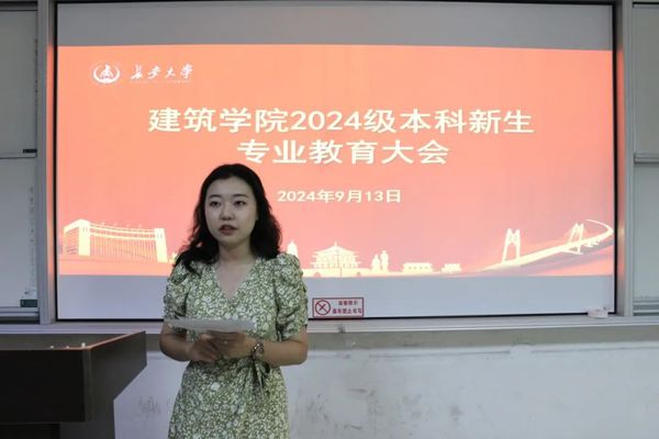 许昕老师从熟悉的建筑物入手,引出建筑学专业概念,并进行深入介绍。同时结合当前AI融入生活的发展趋势,鼓励同学们做好迎接学科智能化、数字化的准备。随后她向新生详细介绍了建筑学专业的培养方案与特色发展模式,希望同学们能够打破学科壁垒,加强交流与合作,为建筑学的学科建设添砖加瓦,贡献自己的力量。