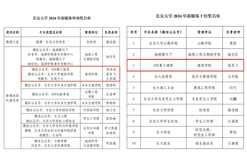 2024年11月,澳门巴黎人赌场 党委宣传部组织开展2024年优秀校园新媒体评选活动,经过自愿申报、推荐审核、WCI与BCI指标综合评选、网络文化建设与管理工作领导小组审议等环节,共有10个新媒体平台评为长安大学 2024 年新媒体十佳奖、23 个平台(团队)获评为长安大学 2024 年新媒体单项奖。澳门巴黎人赌场 新媒体平台“CHU菁才建苑”微信公众号荣获长安大学2024 年新媒体十佳奖;“CHU菁才建苑”微信公众号和“长安大学澳门巴黎人赌场 ”微信公众号荣获 “长安大学新媒体团队建设奖”。
