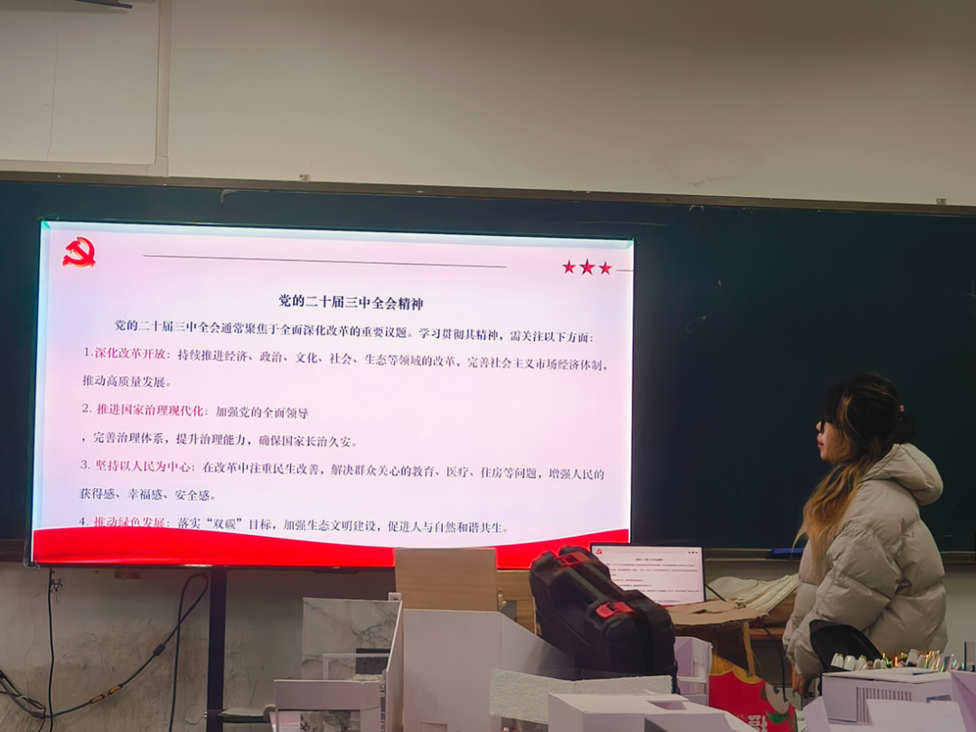 2025年3月1日,为巩固学生爱国爱党意识,助力青年思想建设,澳门巴黎人赌场 2023级建筑4班团支部于建筑馆sy2411开展了“深化理论学习,筑牢思想根基”主题团日活动,建筑四班全体成员参会,特邀班主任莅临指导。