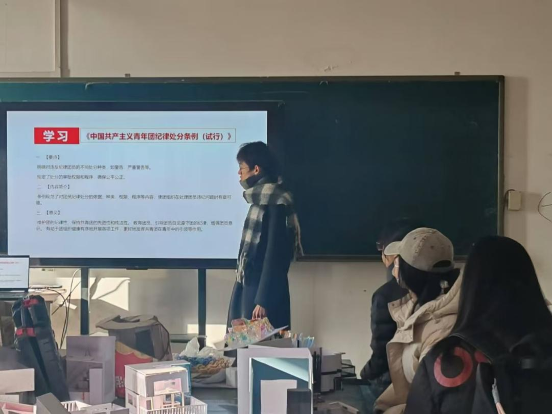 同时,团支部重视青年的思想引领工作,争做青年思想风向标。团支书与同学们分享了《共产主义青年团纪律处分条例(试行)》的部分内容,强调了规章纪律在团内的重要性,深刻响应团中央“从严治团”的决议。随后,班长刘菲同学总述了党的十二届三中全会精神,并呼吁班级成员学习贯彻其精神,将精神融入自身生活。