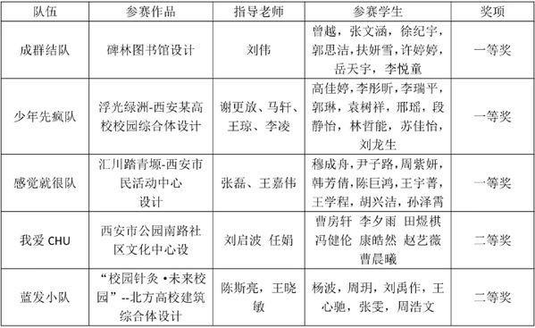 针对“绿色低碳建筑规划与设计”赛道的特点与本次大赛“信息化、工业化、绿色化、智慧化”的要求,澳门巴黎人赌场 高度重视,提前谋划,组建多支队伍参赛,为参赛队伍提供必要的技术指导和物质保障。最终,5支团队入围决赛。刘伟老师指导的“成群结队”团队,谢更放、马轩、王琼、李凌老师指导的“少年先疯队” 团队,张磊、王嘉伟老师指导的“感觉就很队”团队获竞赛一等奖,刘启波、任娟老师指导的“我爱CHU” 团队,陈斯亮,王晓敏老师指导的“蓝发小队”团队获竞赛二等奖,澳门巴黎人赌场 荣获大会优秀组织奖。
