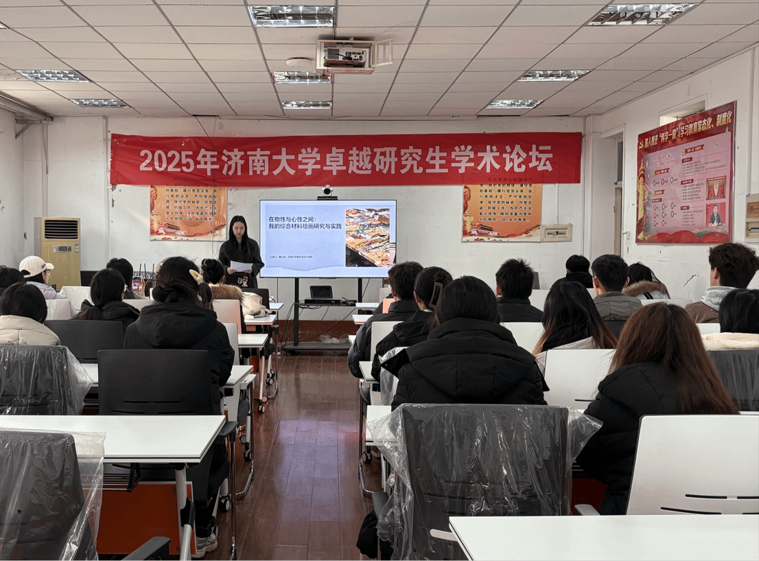 美术硕2301班的戴心怡以《在物性与心性之间:我的综合材料绘画研究与实践》为题交流。从《考工记》等传统造物智慧中汲取灵感,深入探讨了材料“物性”与创作者“心性”之间的内在关联。戴心怡的分享不仅为当代艺术实践寻得了深厚的理论根基,更展示了如何将传统“材美工巧”的工艺追求,转化为融汇古今的综合材料绘画当代语言。