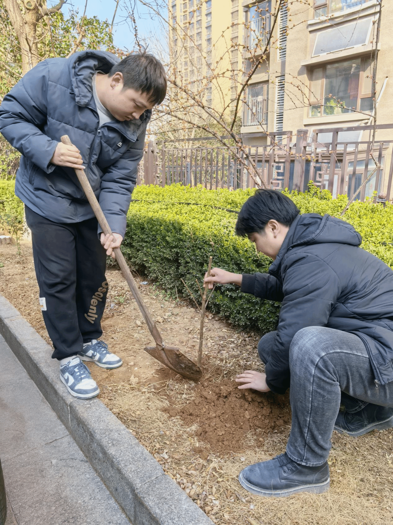 随后,校友们分工协作,挥锹铲土、扶苗填坑、提水浇灌……现场一片热火朝天的劳动景象。大家认真细致地完成每一道工序,并为自己认养的树木挂上精心设计的铭牌。一株株树苗,将来会成为一棵棵参天大树,迎风挺立,陪伴一届届济大学子成长成才,成为校园里一道独特的风景线。
