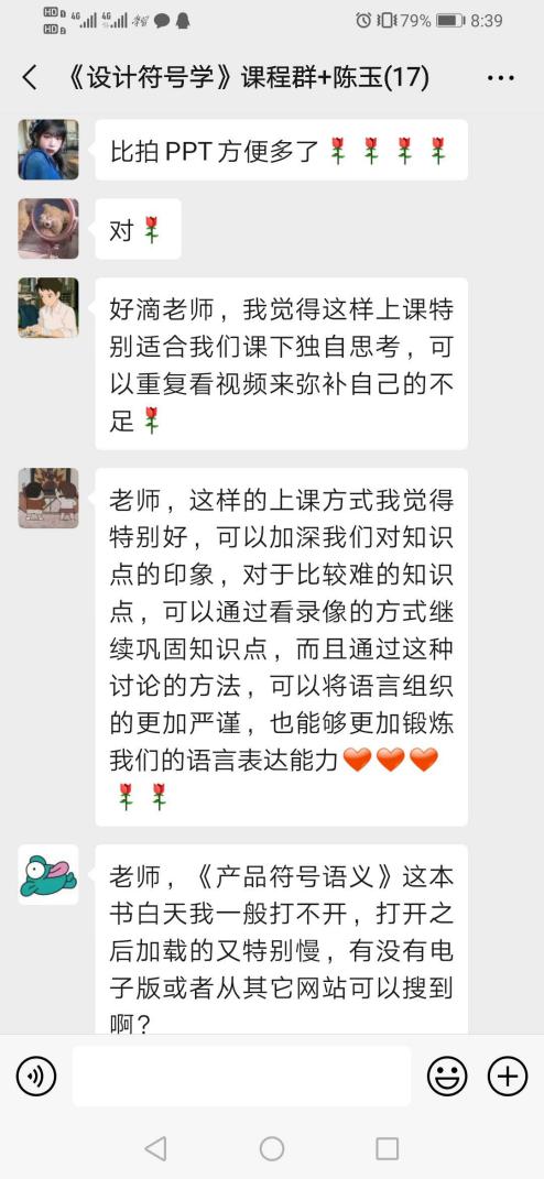 从互动截图中我们可以看到,学生们根据专业方向内容可以在不同的组里交流提问。另外,网上教学已经突破了上课时间的限制,学生们全天都可以进行专业交流。