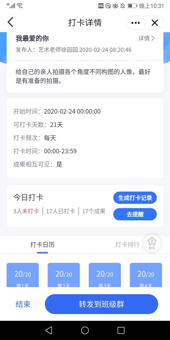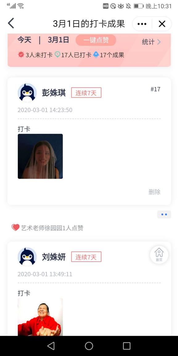 我的课马上进行到开课的第二周,并没有全部在线直播,而是根据课程需要安排了直播与在线学习、在线辅导相并行,我会在QQ课程群,随时管理学生的学习进度,和他们交流学习感受,一起解决遇到的问题。QQ群的“老师助手”可以发布作业也可以师生打卡。通过学生们每天提交的打卡作品我可以深深感受到学生们在一点一滴的进步,那种感觉就好像是看到自己种的庄稼在破土在发芽。