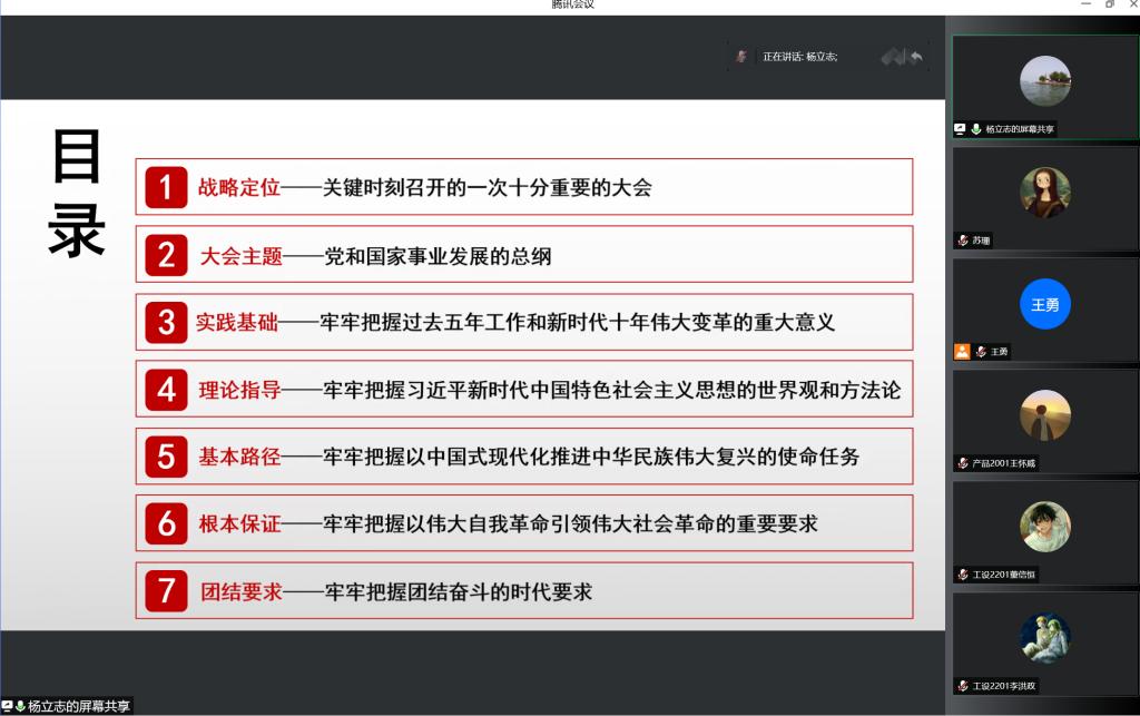 党的二十大是在全党全国各族人民迈上全面建设社会主义现代化国家新征程、向第二个百年奋斗目标进军的关键时刻召开的一次十分重要的大会。本次宣讲会,杨立志教授从战略定位、大会主题、实践基础、理论指导、基本路径、根本保证、团结要求等七个方面,紧密联系当前思想和工作实际,对党的二十大精神作了系统宣讲和深入阐释,指导与会师生更好地理解和把握党的二十大精神。并就中国特色社会主义道路生成逻辑、伟大建党精神的形成过程和丰富内涵、“五个牢牢把握”等相关内容作了深入讲解。与会师生一致认为,宣讲报告重点突出、内容丰富、深入浅出,令人深受教育和启发,并表示要努力学习好、宣传好、贯彻好党的二十大精神,在实际工作中,踔厉奋发,赓续前行,让党的二十大精神入脑入心见行见效。