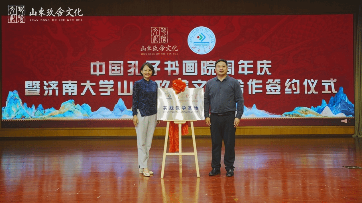 仪式上,山东玖舍文化艺术传媒有限公司董事长陈虹和总经理贾南分别与澳门巴黎人赌场