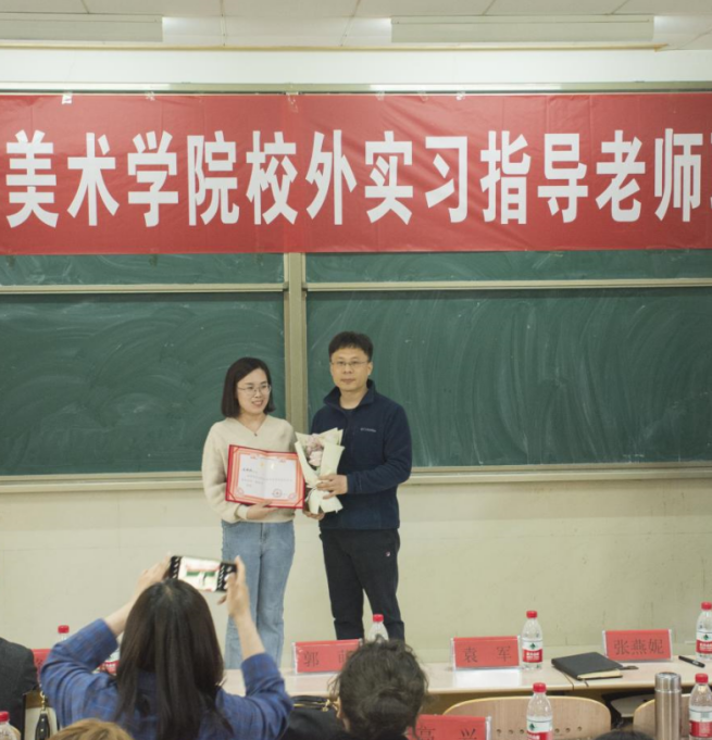 会议第二阶段为教资考试动员大会,校外实习指导教师郭萌、徐立峰、贾晴、国成彪分别发言,指导老师们的发言涉及教资考试的重要性、前期准备、应试技巧,以及美术课程思政的相关内容,共同助力学生的教资考试。