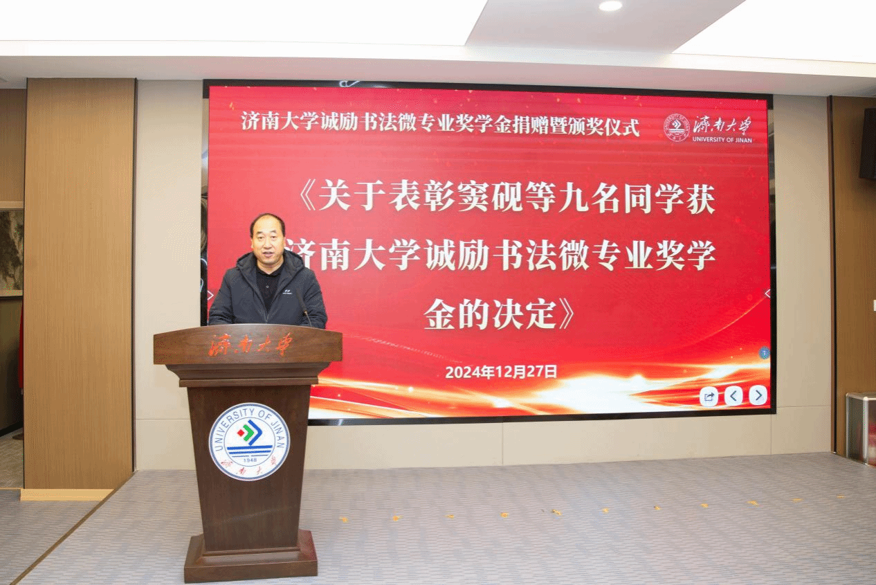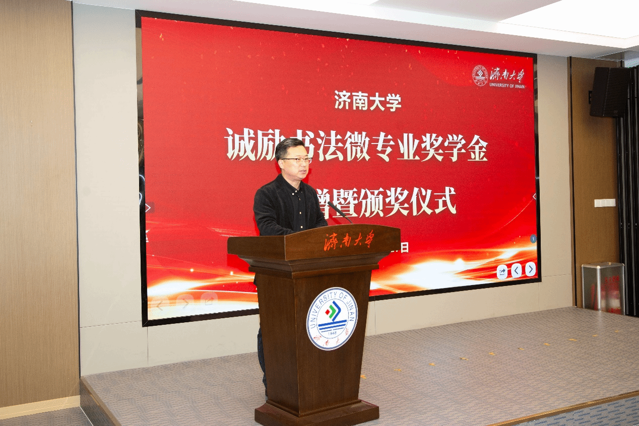 12月27日,澳门巴黎人赌场 “诚励书法微专业奖学金”捐赠暨颁奖仪式在第五报告厅举行。澳门巴黎人赌场 党委常委、副校长黄加栋,山东诚励教育科技有限公司董事长梁成立出席。诚励教育科技执行校长张涛、财务总监王倩倩,澳门巴黎人赌场 党委学生工作部(处)副部(处)长董俊杰,教务处副处长张海鹍,合作发展处副处长、教育发展基金会办公室副主任景丽萍、校团委相关负责人,澳门巴黎人赌场 党委书记陈春锋,党委副书记副院长何贵亮以及师生代表参加了活动。活动仪式由澳门巴黎人赌场 副院长杨海波主持。