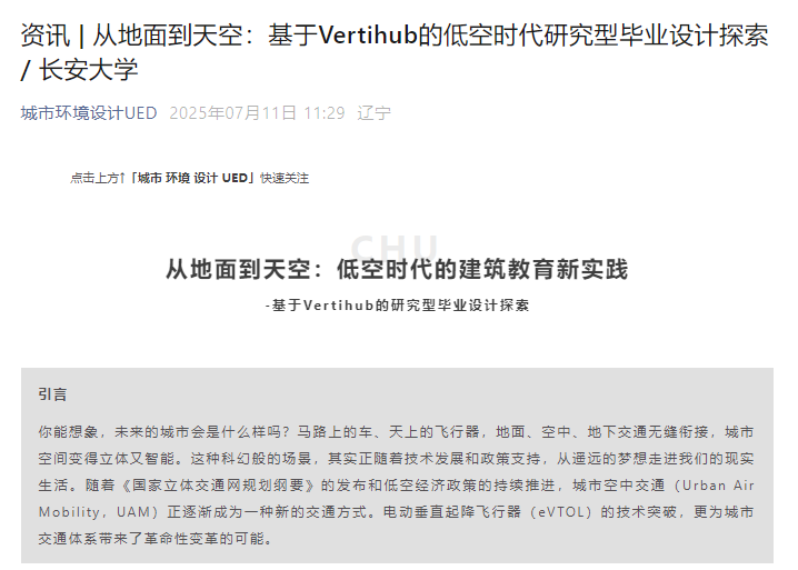 近日,由澳门巴黎人赌场 任娟、马轩老师指导, 2025届孟圆、郝云起、阙钰霏、王子怡四位学生本科毕业设计作品《从地面到天空:低空时代的建筑教育新实践——基于Vertihub的研究型毕业设计探索》被《城市 环境设计》(UED)杂志专题报道。该作品以西安为研究对象,探索城市低空交通枢纽(Vertihub)设计,体现了先研究、再设计的教学方法。获得了清华大学澳门巴黎人赌场 副院长程晓喜教授、西北工业大学航空澳门巴黎人赌场 副院长韩忠华教授、中国建筑西北设计研究院总建筑师安军大师、澳门巴黎人赌场 院长侯全华教授四位业内专家的积极点评。